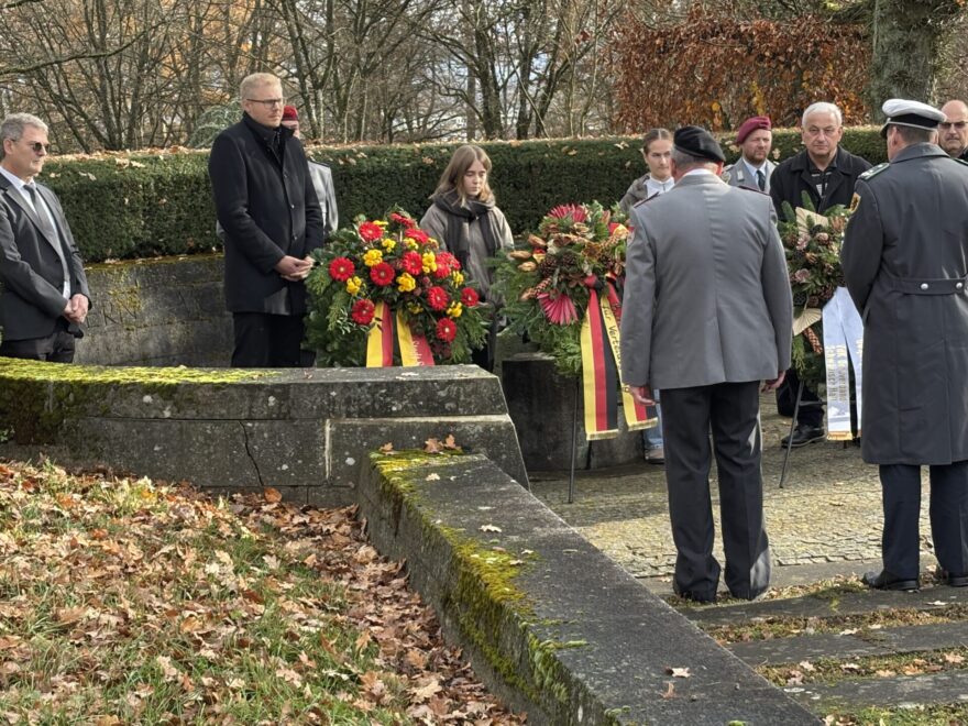 Gemeinsam mit Bürgerinnen und Bürgern, Vertretern von Vereinen und der Stadtverwaltung um Oberbürgermeister Daniel Bullinger legten die Reservisten Kränze an den Ehrenmalen nieder. Die stille Zeremonie, begleitet von Trauermusik, war geprägt von Respekt, Würde und Nachdenklichkeit.